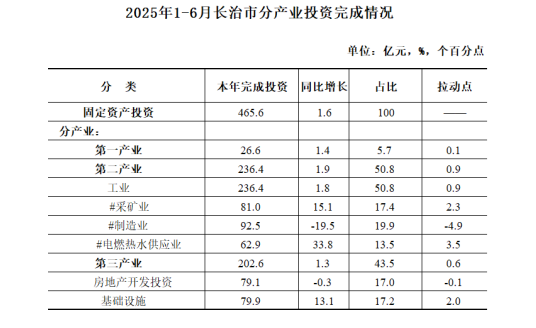 2025年上半年,长治市深入贯彻中央、省、市经济工作会议部署,紧扣高质量发展主题,以“拼抢实”的作风推进项目建设,全年固定资产投资呈现“稳中有进、结构优化”的发展态势。全市固定资产投资完成465.6亿元,同比增长1.6%,其中工业投资韧性凸显,基础设施投资持续发力,新开工项目实现量质齐升,为经济高质量发展提供了坚实支撑。