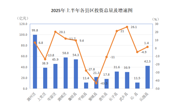 从增速看,县区投资增速“七增五降”。增幅较高的是武乡县26.1%、长子县21.0%、屯留区20.1%;降幅较大的是上党区-13.8%、平顺县-27.8%、黎城县-43.5%。增速最高的武乡县与增速最低的黎城县相差69.6个百分点。