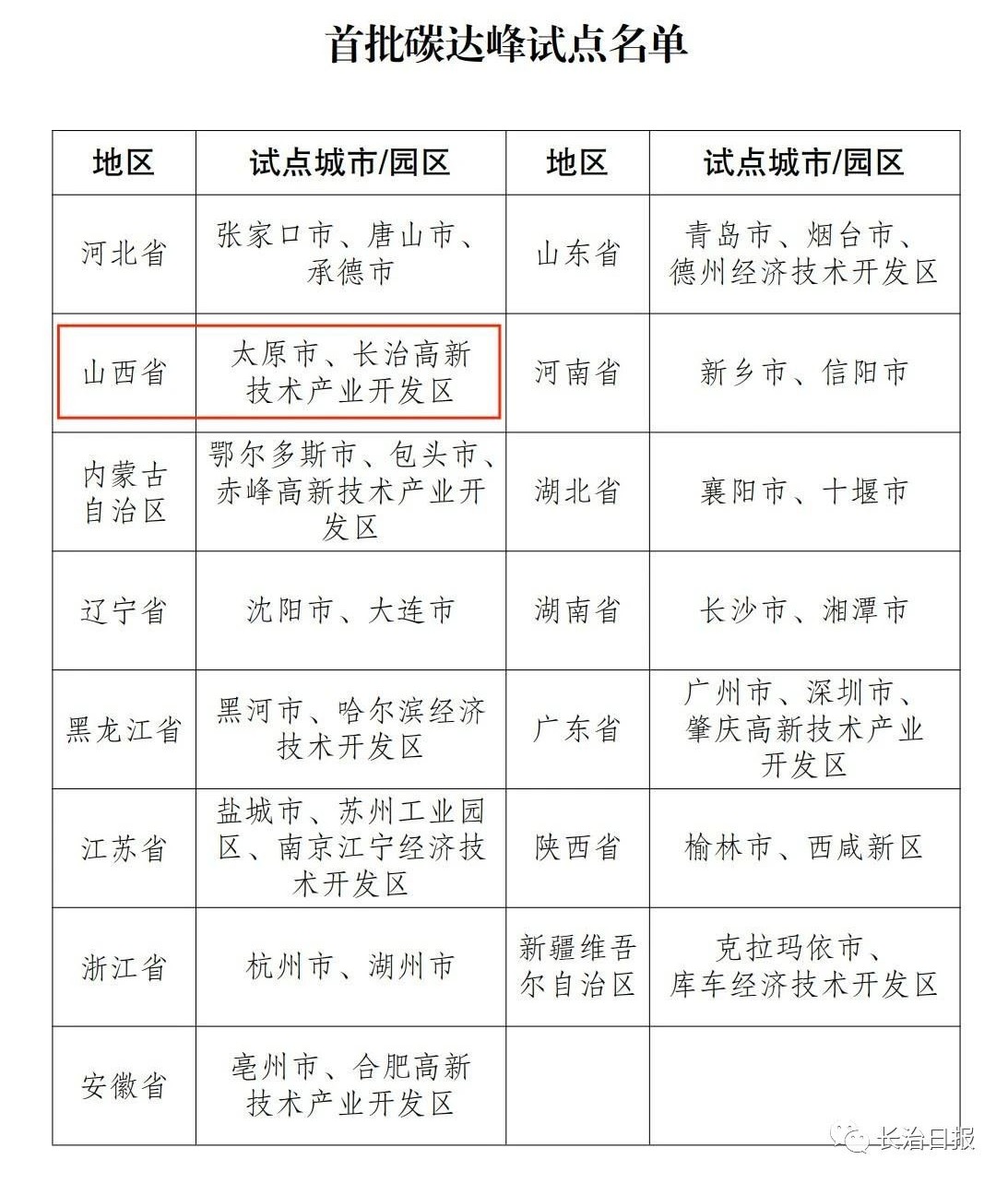 12月6日,国家发展改革委发布首批碳达峰试点城市和园区名单,全国25个城市、10个园区上榜。长治高新技术产业开发区作为全省唯一一家园区成功入选。